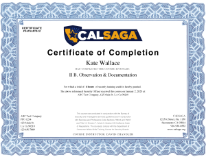 the individual completing the course. The certificate shall identify the course(s) taken, the number of hours of training provided, identification of the issuing entity, name of the individual and instructor and a date, and state that the course(s) comply with the Department of Consumer Affairs’ Skills Training Course for Security Guards and Proprietary Private Security Officers. The certificate shall be serially numbered for tracking. An institution or company providing the training shall maintain the Certificates of Completion for a period of no less than two years.